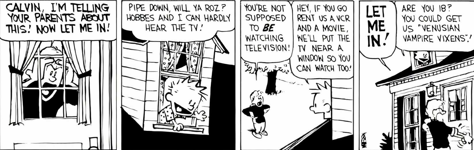 En este Calvin y Hobbes En esta entrega, Calvin está en serios problemas, pero está dispuesto a arriesgarlo todo por un rato frente al televisor. Después de haber dejado a su niñera Roz fuera de la casa, Calvin le implora que se quede callada para poder ver la televisión.sólo para que le digan que es “No se supone que esté viendo la televisión”. ” Calvin entonces intenta razonar con Roz, negociando que si ella lo hace, entonces…ir a alquilar [them] una videograbadora“Pondrá el televisor en un lugar donde ella pueda verlo. Cuando esto no funciona, Calvin, sin inmutarse, incluso sugiere que la desventurada niñera podría alquilarles una película para adultos.