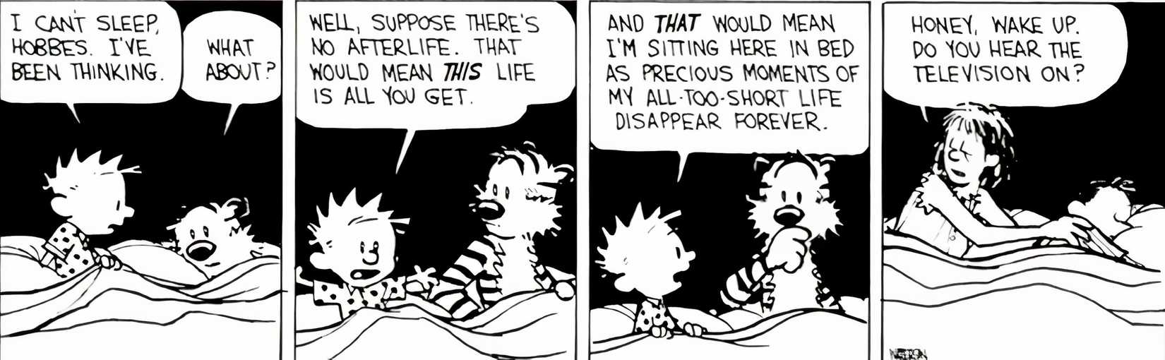 Curiosamente, este no es el objetivo del cómic, sino más bien su planteamiento. Cuando el cuadro final pasa a la habitación de los padres de Calvin, su madre se despierta sobresaltada, sacude a su marido y dice: “Cariño, despierta, ¿escuchas la televisión encendida?“ En otras palabras, la reflexión de Calvino sobre la mortalidad y la vida plena lo impulsó a hacer lo que más le importa: mirar televisión.