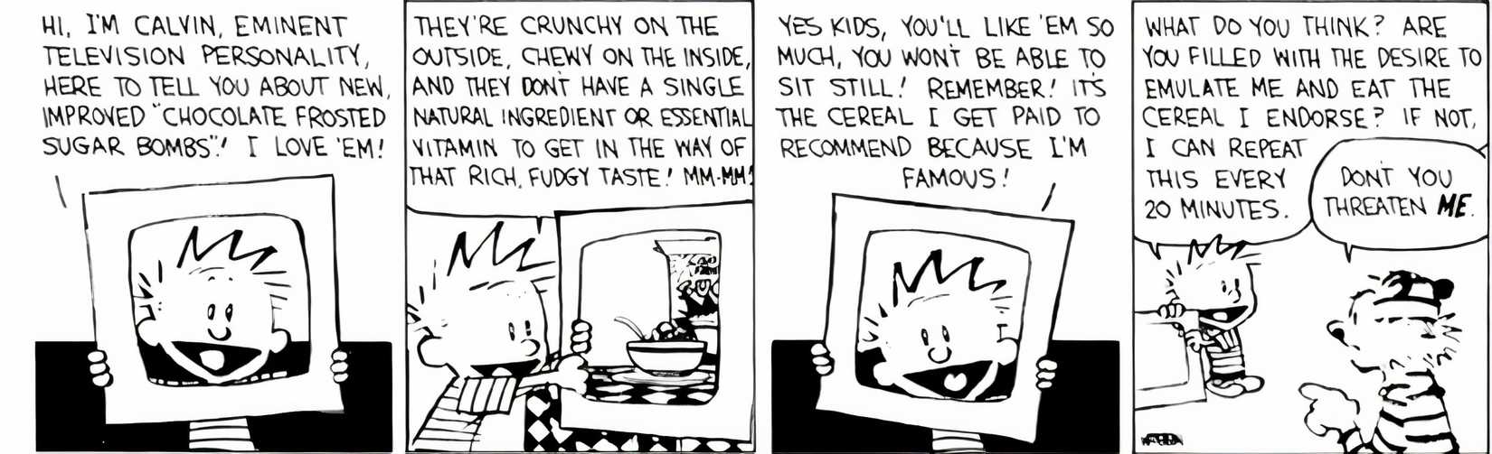 El chiste del cómic llega cuando Calvin concluye su “anuncio” señalando que si el público, Hobbes, no está convencido por su discurso, él “Puede repetir esto cada veinte minutos.”, a lo que Hobbes responde enfáticamente: “No me amenaces“La tira se burla brillantemente de la idea de que no es sólo la programación televisiva la que tiene la capacidad de distorsionar las mentes de las personas, sino que la publicidad televisiva también tiene sus propias consecuencias en la exposición del espectador a largo plazo.