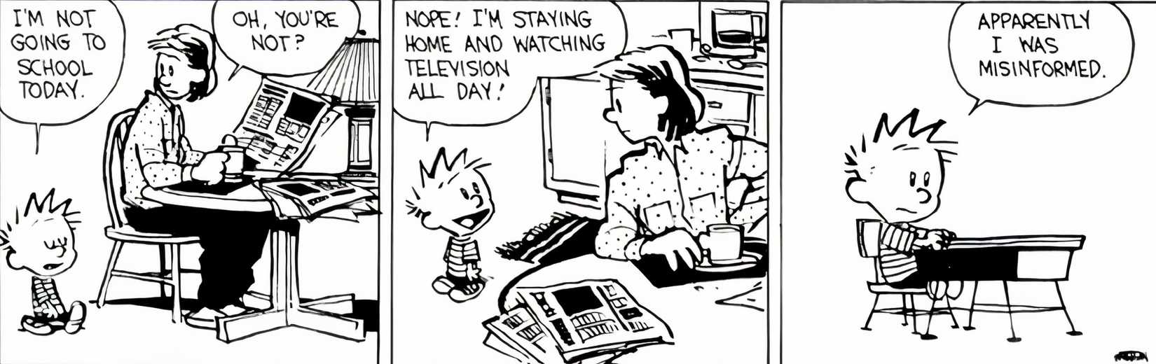 En este sencillo pero efectivo Calvin y Hobbes En la caricatura, Calvin comienza informando definitivamente a su madre que él es “No voy a la escuela hoy.” Cuando ella responde con escepticismo, él le explica su plan: dejar la escuela y mirar televisión. El tercer y último panel presenta a Calvin sentado en su escritorio de la escuela, contra un fondo blanco absoluto, anotando solemnemente “Al parecer me informaron mal.”