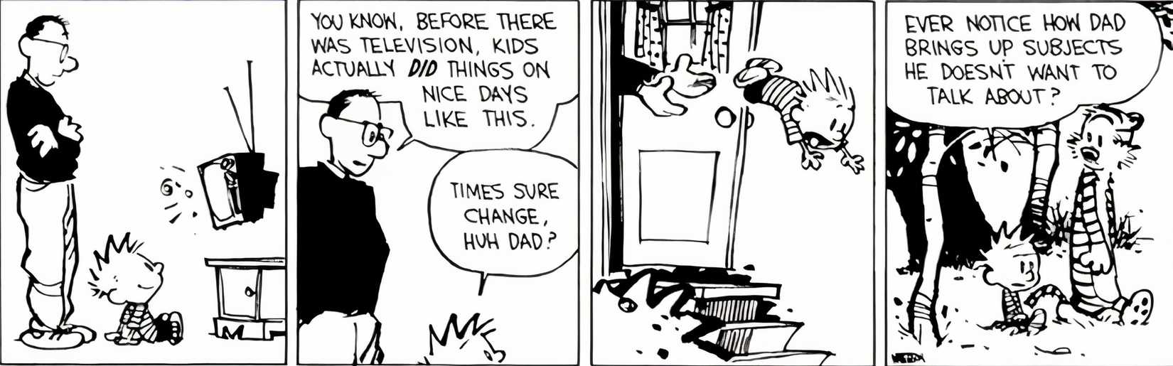En esta tira, Calvin descubre una vez más que su plan de ver la televisión choca con las expectativas que sus padres tenían de él. Aquí, el padre de Calvin intenta con delicadeza animar a su hijo a salir al exterior, en lugar de sentarse frente al televisor todo el día. Es decir, empieza con delicadeza: Cuando Calvin lo ignora diciendo:Las cosas sí que cambian, ¿eh, papá?“Luego lo echaron por la puerta principal..