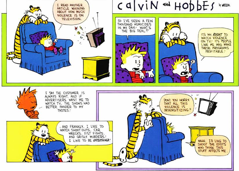 Calvino ensalza extensamente las virtudes del entretenimiento violento, a lo que Hobbes simplemente le pregunta si le preocupa su efecto desensibilizante. La controvertida respuesta de Calvino de que “Me gusta dispararle a los idiotas que piensan que esas cosas me afectan.” es oscuramente satírica, lo que deja en evidencia que Watterson creía que la violencia ficticia, especialmente en la televisión, podía de hecho tener un efecto negativo en los espectadores impresionables. O, al menos, que si bien puede que no lleve a los espectadores a la violencia, sí altera su percepción de la violencia y sus consecuencias, lo que la convierte en otra obra profundamente relevante desde el punto de vista social. Calvin y Hobbes dibujos animados.