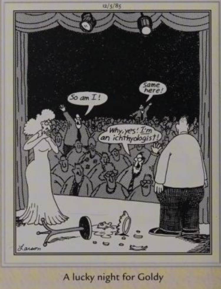 En lo que explica el título es “Una noche de suerte para Goldy“No hay uno, ni dos, sino tres Ictyólogoso científicos de peces, que asistieron al programa, que inmediatamente saltan a la acción. Este Lado lejano La caricatura es un riff delirantemente divertido sobre el “¿Alguien está aquí?” Tropo, uno que Gary Larson ejecuta el tono de perfección.