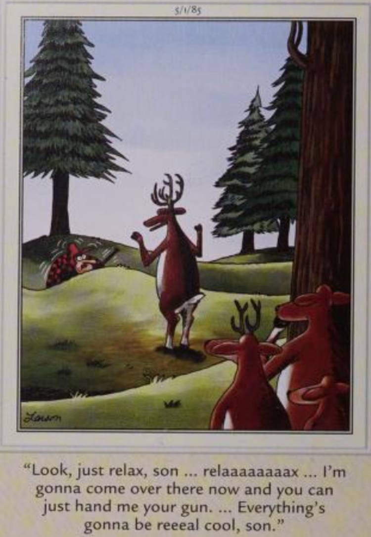 Al representar el cazador que temblaba con Feer, totalmente fuera de su elemento, y los ciervos como tranquilos y calculados, Gary Larson invierte brillantemente la dinámica familiar aquí, ante el resultado es una interacción escandalosamente divertida entre el hombre y el animal, uno en el que el animal se ve buscando mucho más razonable que el humano.