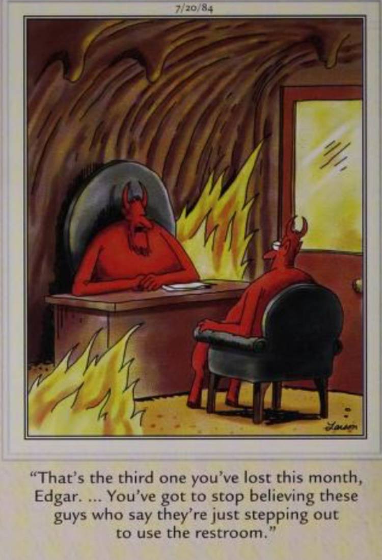 “Tienes que dejar de creer a estos tipos cuando dicen que están saliendo para usar el baño“Agrega, pintando un retrato de un demonio crédulo, que no se corta por torturar almas en Perdition. Solo Gary Larson se aventuró a hacer esta forma de parodia de” comedia en el lugar de trabajo “en ese momento, que abovedó El lado lejano al éxito nacional a mediados de los 80.