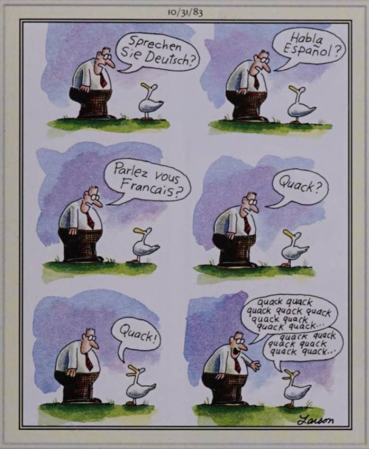 En esto Lado lejano Caricatura, Gary Larson se desvía de su formato habitual de imagen única para entregar una secuencia de imágenes, en la que Un hombre se acerca a un pato y pregunta si habla alemán, español o francés, antes de finalmente hablar en su lengua materna, lo que lleva a un intercambio de diálogono traducido para el lector, que consiste en una serie de charlatanes rápidos.