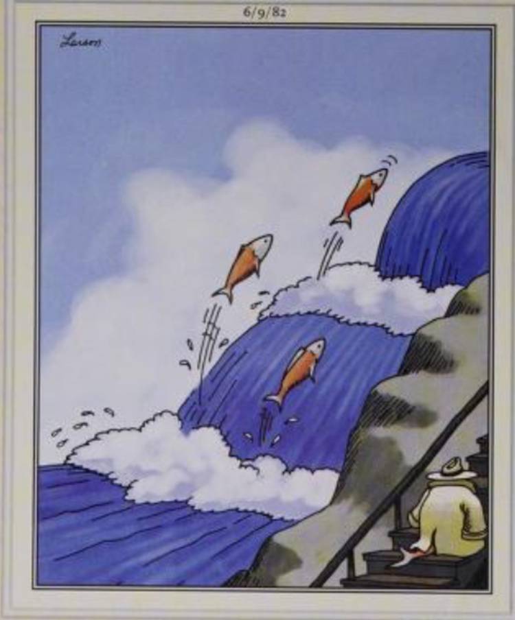 Este Lado lejano El cómic es maravillosamente extraño y certificadamente brillante. Sin necesidad de una leyenda, Gary Larson transmite perfectamente un escenario surrealista y de risa y risa, en el que una escuela de salmón está haciendo el difícil viaje río arriba para aparearse …Excepto uno, que toma un atajo, de alguna manera, usando las escaleras al lado de la corriente.