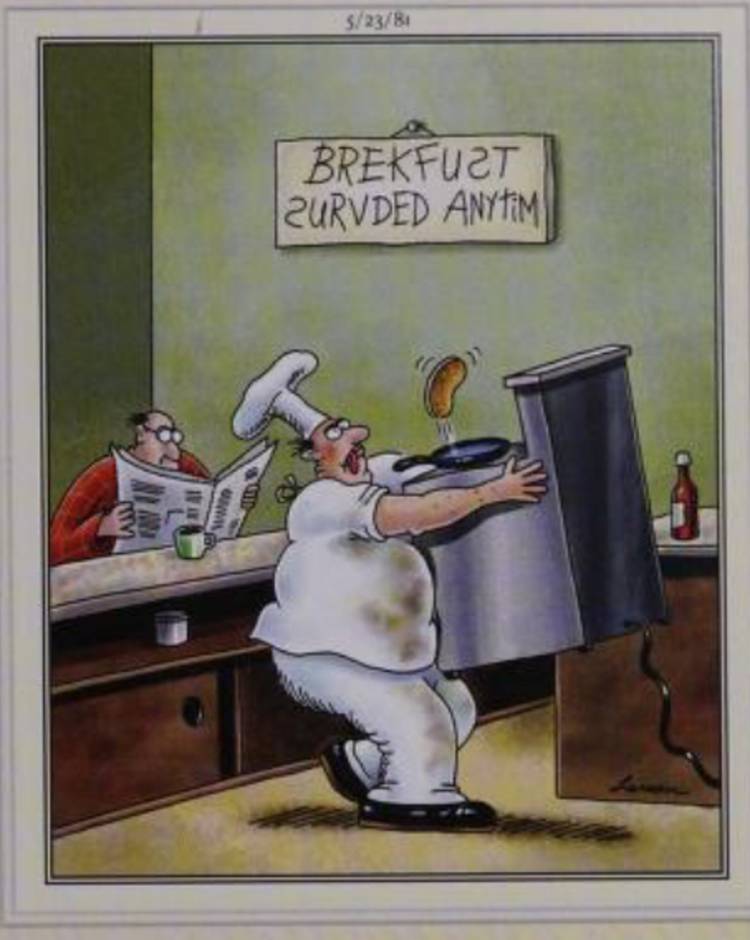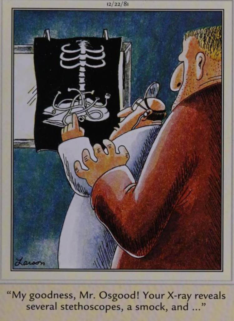 Este es un gran ejemplo altamente subestimado de la habilidad de composición de Gary Larson, que fue una gran parte de lo que hizo El lado lejano excelente. Aquí, Larson representa a un médico que mira la radiografía de un paciente, con la espalda que se volvió hacia el paciente, lo cual es una mala noticia para él, ya que no se da cuenta del hombre que está en la habitación con médicos comidas.