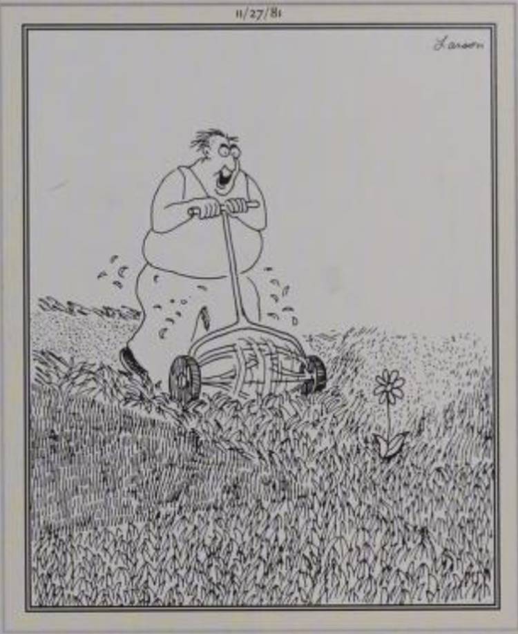 Las características del panel Un hombre cortando su césped, aparentemente poseído con energía loca, gritando una especie de grito de batalla mientras apunta a su cortacésped a la sola flor creciendo fuera de la hierba. Es una broma que los lectores no deberían cometer el error de pensar demasiado; No hay nada más profundo, y eso es lo que lo convierte en un clásico de Gary Larson.
