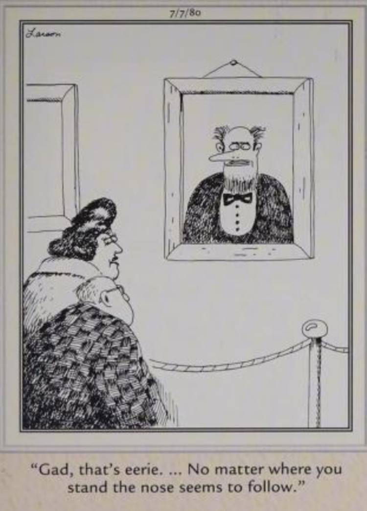 En esta divertida entrada del primer año de El lado lejanoGary Larson riffs sobre una experiencia clásica de museo: el retrato con una mirada que parece seguir al espectador donde sea que esté parado. Excepto en este caso, Larson deliciosamente Intercambia los ojos por las fosas nasales, como comenta una mujer “.No importa dónde te pares, la nariz parece seguir“