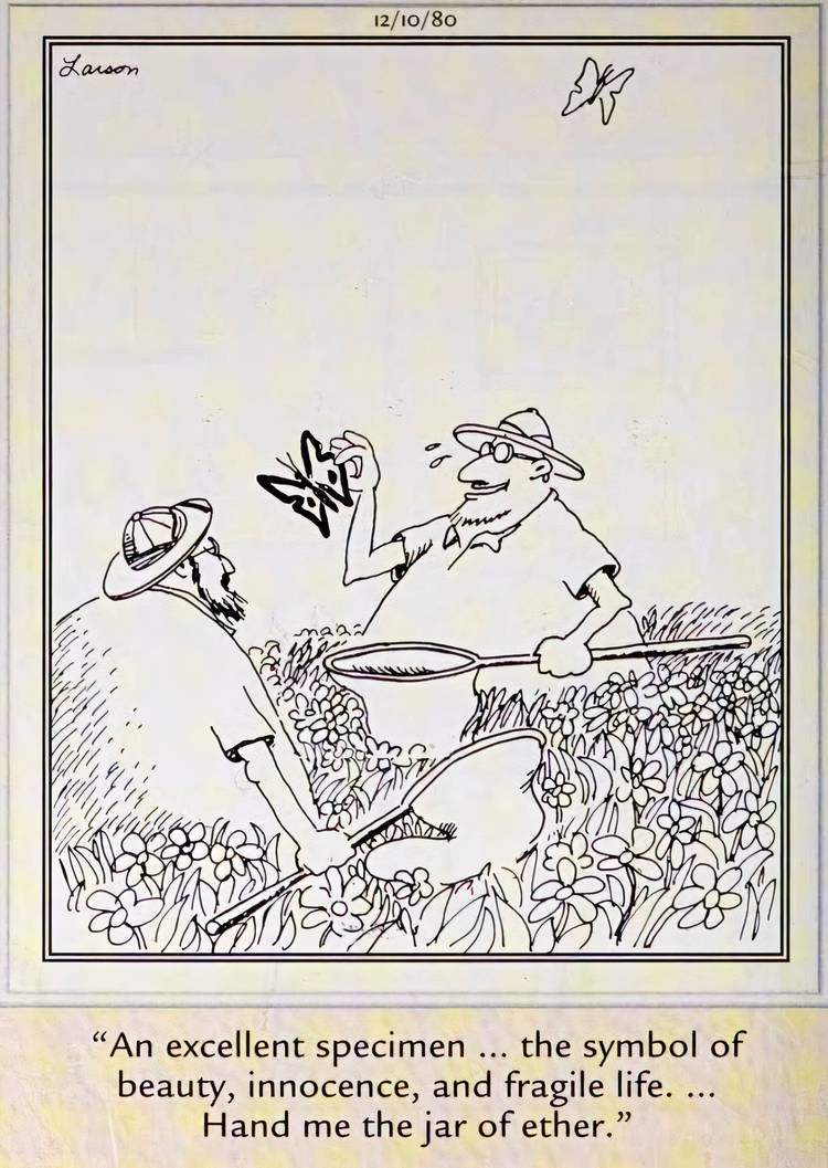 En uno de los primeros Lado lejano En sus caricaturas de mariposas, Gary Larson describe de forma inequívoca la incongruencia inherente de la caza de mariposas. Un cazador satisfecho sostiene una mariposa por el ala, llamándolo “Un excelente ejemplary luego explica con más detalle que es ““El símbolo de la belleza, la inocencia y la vida frágil”. antes de decirle sin piedad a su compañero: “mano [him] El tarro de éter.”