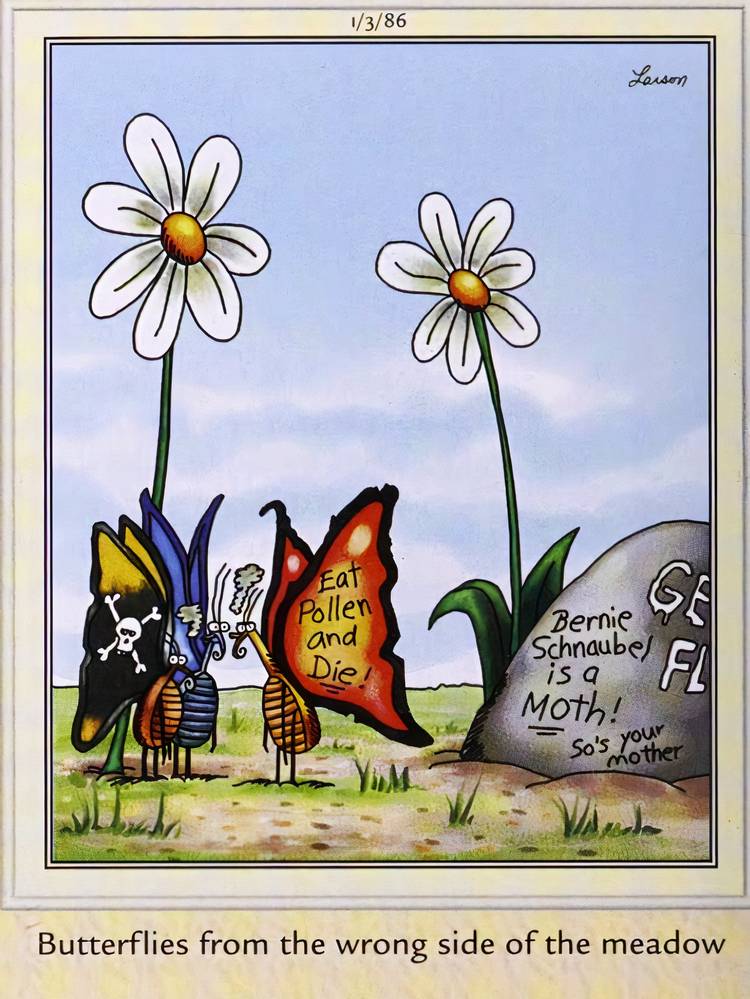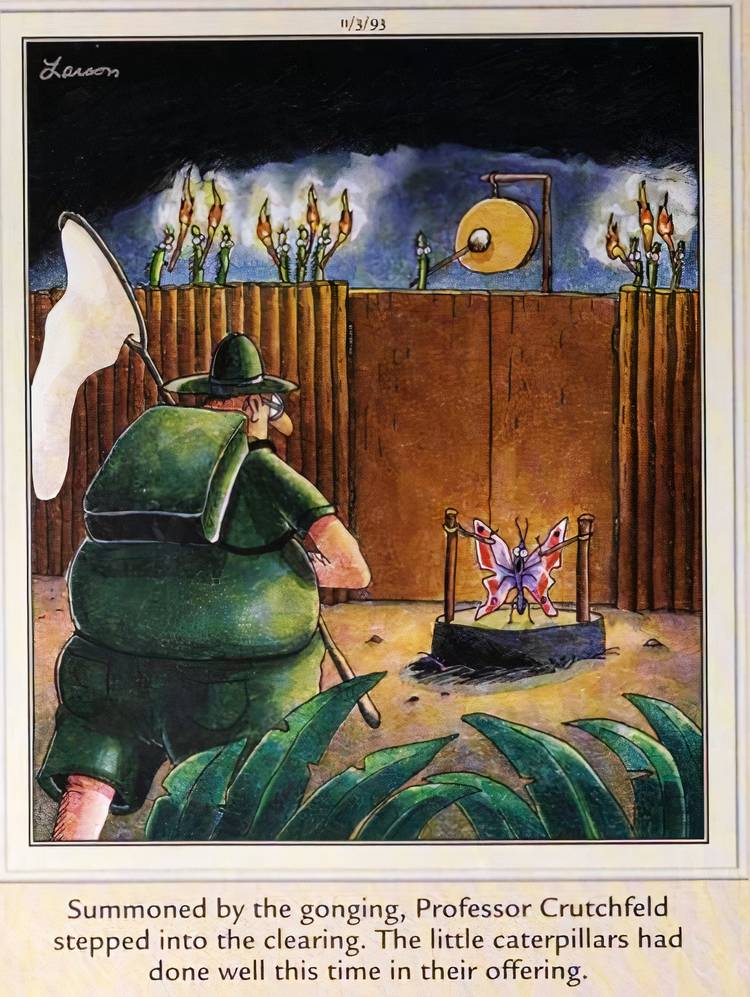 La lepidopterología, o el estudio de las mariposas, fue una pasión personal de Larson y, como resultado, su Lado lejano Las apariencias ofrecen una visión casi panorámica del sentido del humor del artista. Si bien en la mayoría de los casos, las simpatías de Gary Larson parecían estar más bien con los animales que con los humanos, es interesante observar que parodiaba tanto a los cazadores de mariposas como a las propias mariposas con igual aplomo.