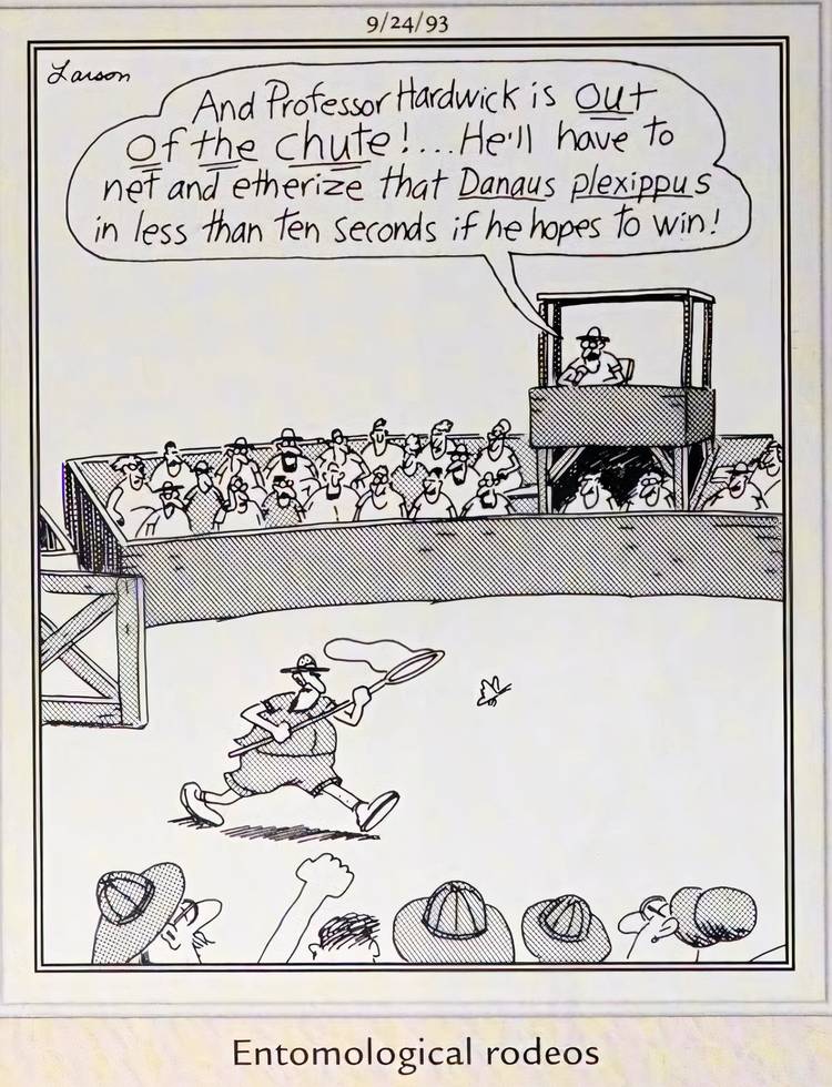 En este Lado lejano Panel, Gary Larson reimagina brillantemente Un rodeo con mariposas sustituidas por toros y un lepidoterólogo en lugar de un vaquero, mientras el “Profesor Hardwick” busca ganar un premio atrapando una mariposa con una red. en menos de diez segundos.