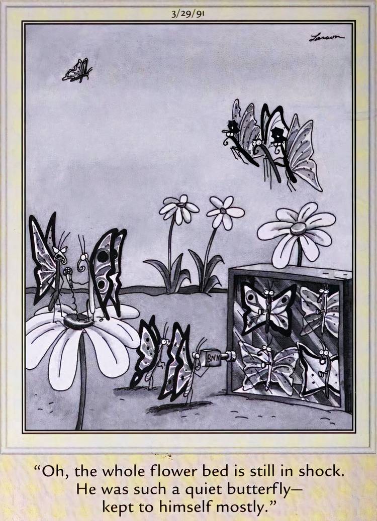 En múltiples paneles a lo largo de los años, Gary Larson encontró humor en la extraña paradoja de la lepidóptería, un campo en el que se venera la belleza del sujeto… matándolo. Esta es quizás la extrapolación más divertida de esta premisa, ya que El tropo de los vecinos de un asesino en serie que dan una entrevista después de que se exponen sus crímenes se combina con la práctica de embalsamar y enmarcar mariposas.
