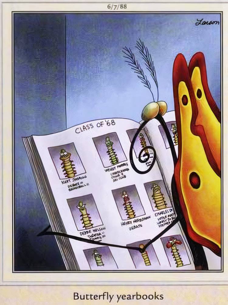 Si tuvieran la oportunidad, muchas personas volverían a su juventud, incluso si no pudieran cambiar nada, solo para experimentar los altibajos de crecer de nuevo. Al elegir una especie de insecto conocida por una de las transformaciones más radicales de la naturaleza, Gary Larson agregó una dimensión potente a esta frase final, permitiendo que la imagen hiciera una observación audaz sobre la naturaleza del envejecimiento.