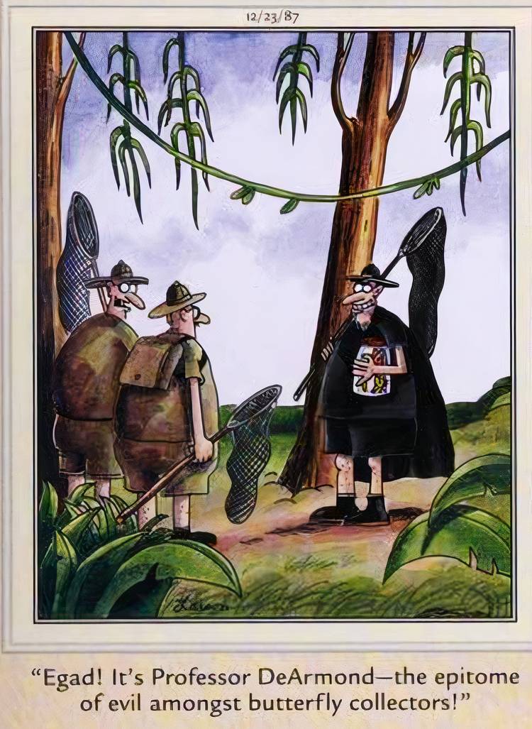 Este Lado lejano La caricatura vuelve a burlarse de los lepidopteristas, al insinuar que existe un lado sórdido de la subcultura. El panel muestra a dos hombres con redes para mariposas, vestidos de marrón apagado, “encontrarse cara a cara con un homólogo vestido de negro en el bosque”.¡Dios mío! Soy el profesor DeArmond.“uno de ellos declara, señalando que es, “¡El epítome del mal entre los coleccionistas de mariposas!”