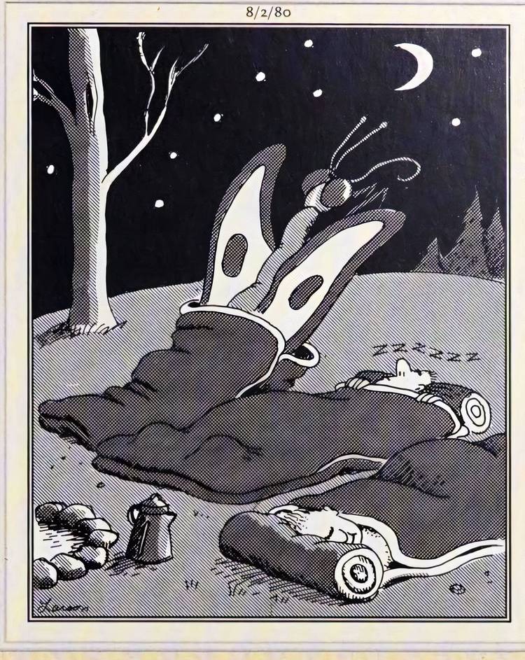 En este extraño y maravilloso Lado lejanoGary Larson encuentra la hilaridad en un escenario completamente kafkiano, Cuando una persona en un viaje de campamento emerge de su saco de dormir como una mariposa de tamaño humano.pareciendo como si estuvieran a punto de volar hacia la noche y dejar atrás a sus compañeros, todavía humanos.