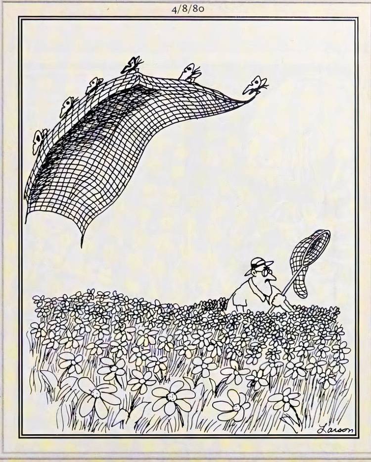 El lado lejano La primera caricatura de mariposas es un ejemplo temprano de la capacidad de Gary Larson para darle la vuelta a algo familiar para provocar una risa. En este caso, Un cazador de mariposas se arrastra a través de la hierba alta, sosteniendo su red en alto, mientras un grupo de mariposas se acerca sigilosamente detrás de él con su propia red. cambiando la dinámica entre ambos.