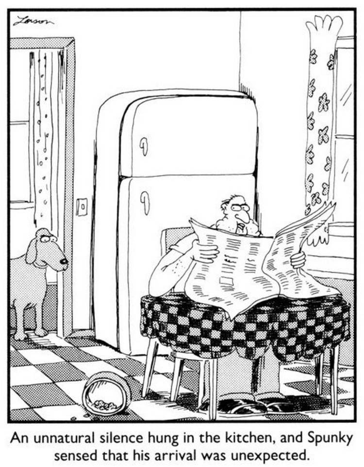 Como muchos Lado lejano En las historietas, el perro parece un poco más inteligente que el humano, ya que sabe enseguida que algo anda mal y qué está pasando exactamente. Con frecuencia se retrata a los animales como más inteligentes y con características más positivas en general que las personas, y esta tira cómica es otro cómic para agregar a la lista.