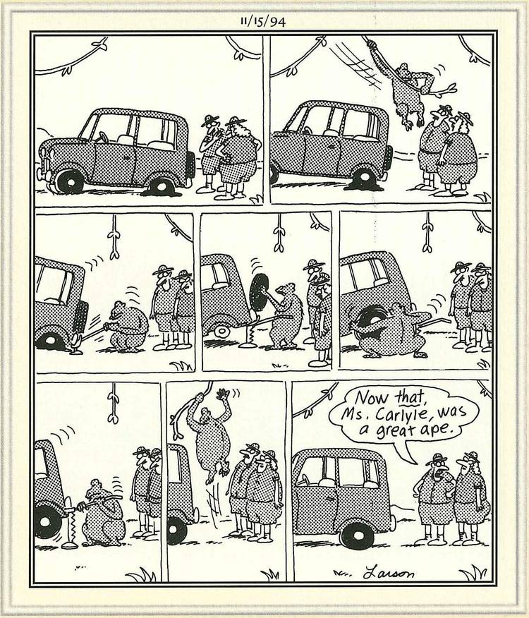 Cuando dos exploradores en la jungla se pinchan en un momento muy inoportuno, un simio transeúnte muy útil viene a rescatarlos y les cambia la llanta. El servicio excepcional del primate lleva a uno de los exploradores a exclamar que estaban “a gran simio.“Otro ejemplo que añadir a los muchos Lado lejano cómics que utilizan juegos de palabras y juegos de palabras”,un gran simio“tiene el doble significado perfecto en la tira.