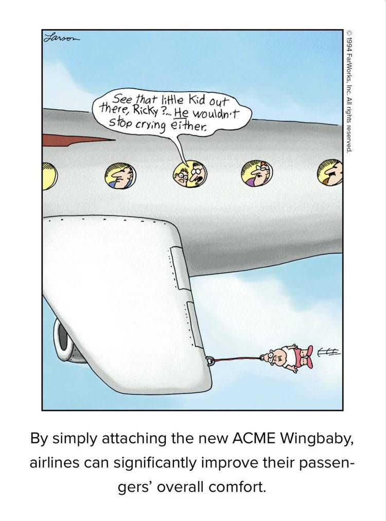 Al asustar a los niños para que no lloren en el avión, y posiblemente para que nunca vuelvan a llorar, se calcula que mejorará la comodidad de todos en el avión. Un excelente ejemplo de El lado lejano sentido del humor oscuro, la idea de asustar a los niños diciéndoles que si no dejan de tener dolor de barriga, también los colgarán fuera de un avión no sería la primera estrategia de nadie para evitar que los niños lloren en los aviones.