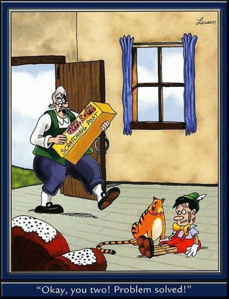 Cuando Pinocho tiene marcas de garras en toda su carita de madera y el gato de la familia está peligrosamente cerca de él, Geppetto llega a tiempo con justo lo que necesita: un rascador para su agresivo gato. Lo primero que uno piensa sobre lo que debe ser ser un títere que habla y camina no implicaría ser usado como rascador para el gato de la familia, pero, sin embargo, esa es la situación del pobre Pinocho.