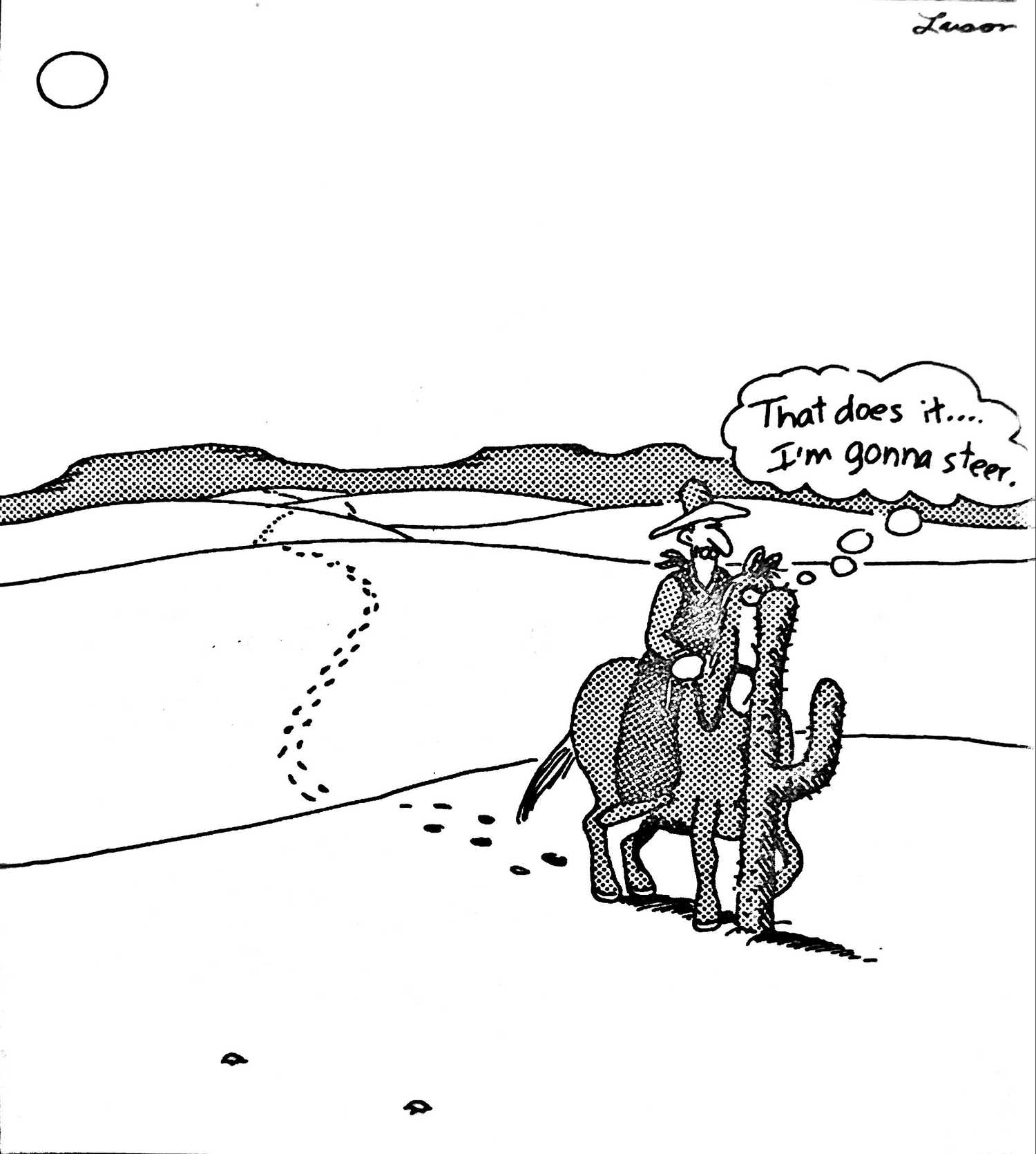 En medio de la nada, un vaquero conduce su caballo hacia un cactus, lo que hace que el pobre caballo decida que ahora asumirá las responsabilidades de dirección, ya que su dueño obviamente no está a la altura de la tarea. El hecho de que el vaquero haya conducido al caballo directamente hacia un cactus, a pesar de que en ninguna otra zona había cactus, hace comprensible al cien por cien por qué el caballo finalmente lo ha conseguido y quiere tomar el control.