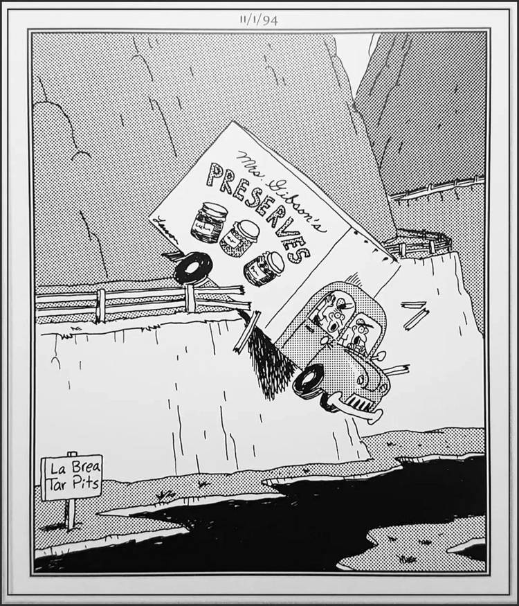A Larson siempre le gustó incluir una buena dosis de ironía en El otro lado tiras cómicas, con un ejemplo notable en esta tira. Cuando un camión lleno de conservas de frutas se sale de la carretera y se adentra en La Brea Tar Pits, están a punto de ser preservadas una vez más por los pozos de alquitrán, que han preservado los antiguos restos de las primeras criaturas. Como resultado, el camión de conservas y sus desafortunados habitantes están a punto de ser preservados por La Brea Tar Pits.