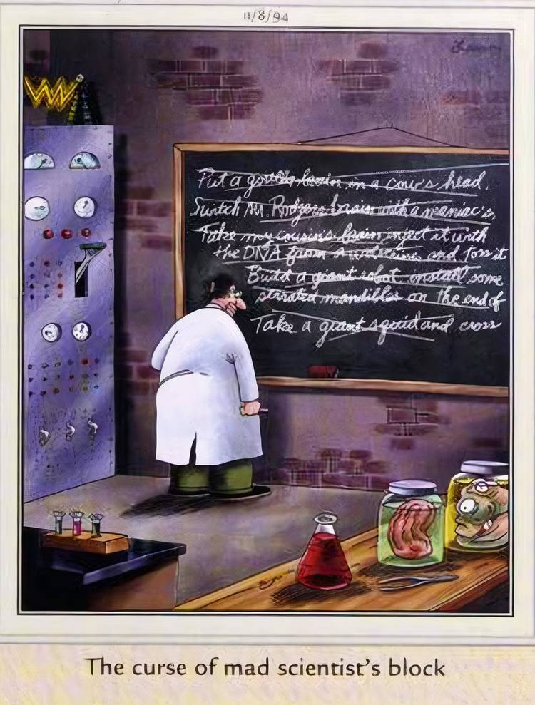 El bloqueo del escritor, un fenómeno en el que uno lucha por encontrar buenas ideas para su trabajo, puede ocurrirle incluso a los autores más talentosos. En El otro lado, A los científicos locos también les puede ocurrir un bloqueo mental. Como lo ilustra una tira cómica, un científico loco lucha por superar su bloqueo mental incluso después de escribir un montón de ideas alocadas y luego tacharlas abruptamente cuando considera que no son buenas.