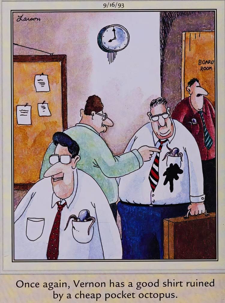Un trabajador en este cómic descubre que su pulpo de bolsillo ha arrojado tinta por toda su camisa, imitando cómo un bolígrafo puede explotar y obtener tinta en toda la tela. Vernon realmente debería haber derrochado en un pulpo de bolsillo más caro en lugar de jugarlo a salvo con uno barato.