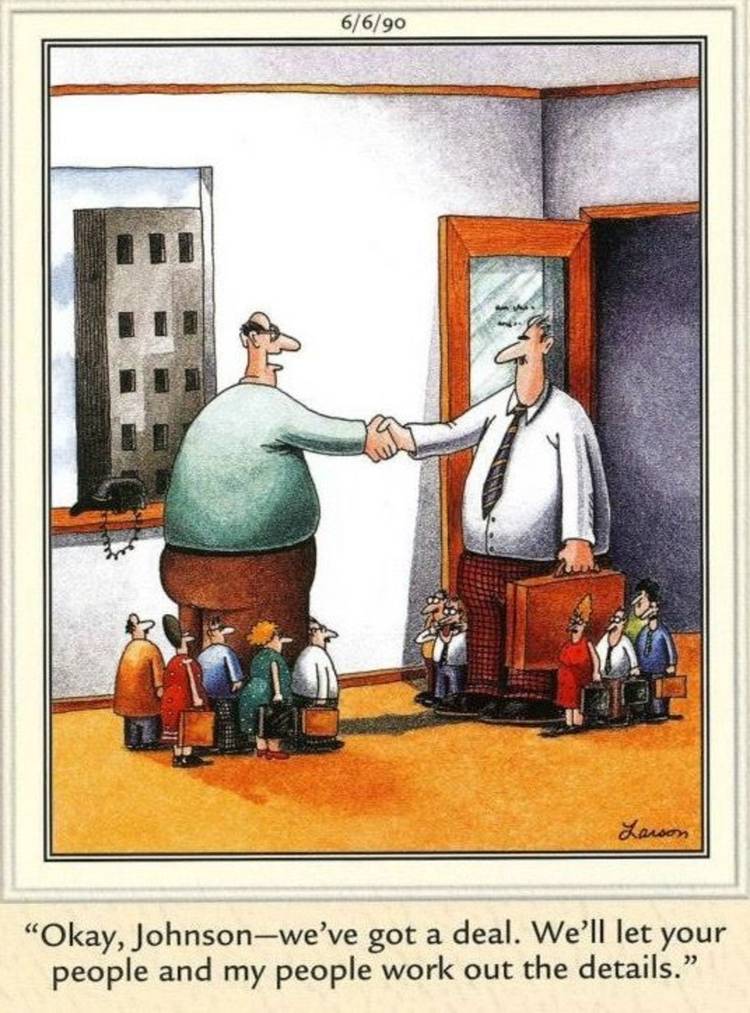 Hacer un acuerdo comercial requiere muchas manos en la cubierta, ya que hay muchos empleados involucrados en el proceso de negociación y exponiendo el papeleo. Este Lado lejano Los dibujos animados juegan con esa idea de manera cómica, ya que dos hombres se dan la mano y acuerdan un acuerdo entre sí, aunque este acuerdo es todo menos normal.