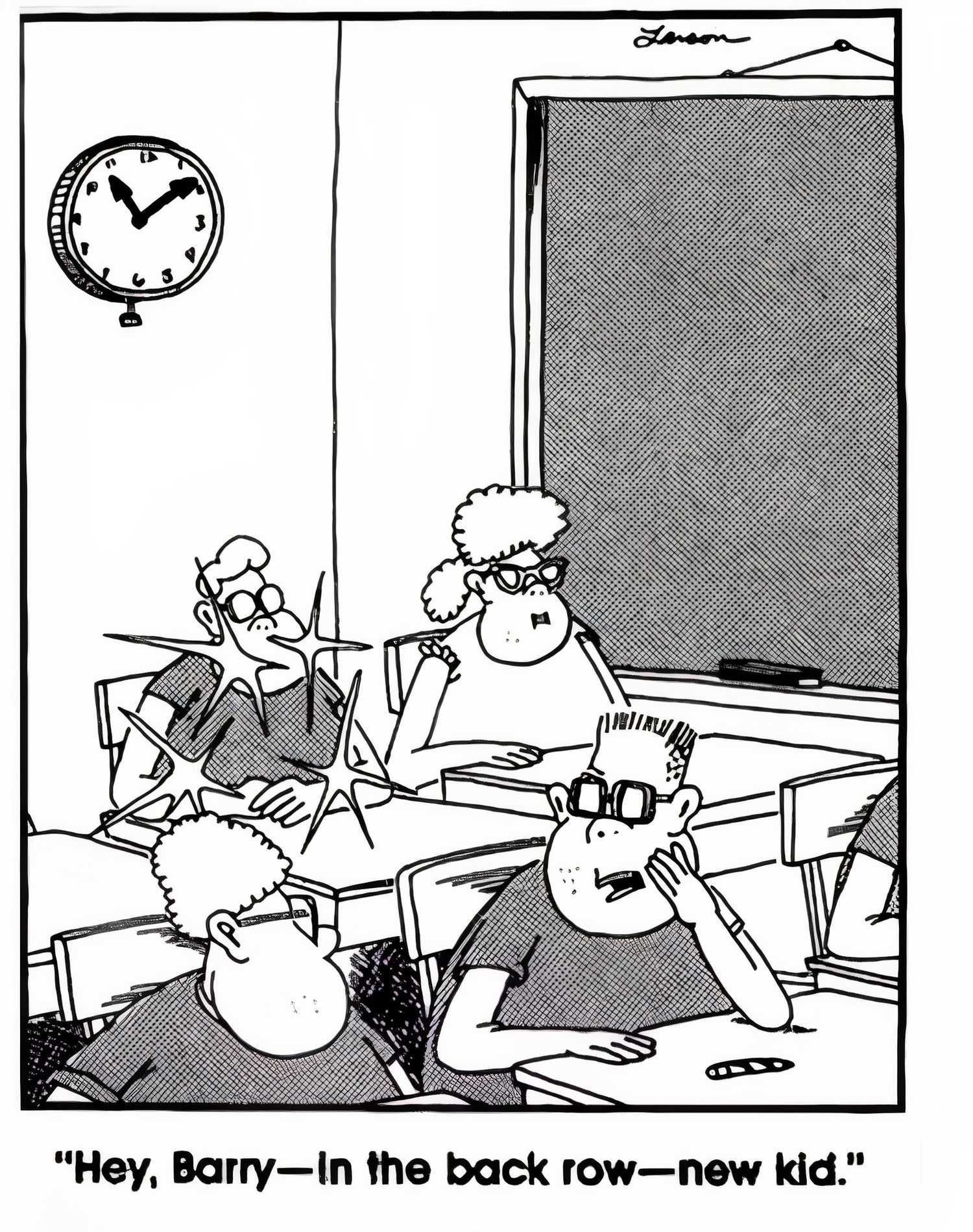 La mayoría de nosotros hemos sido el “Niño nuevo” O visto el tropo en libros y películas. Larson le da a este concepto un giro visual de Mostrando al niño nuevo literalmente brillantedestacando su nueva llegada con un brillo exagerado. Es una mordaza simple que convierte una sensación familiar en una exageración digna de dibujos animados.