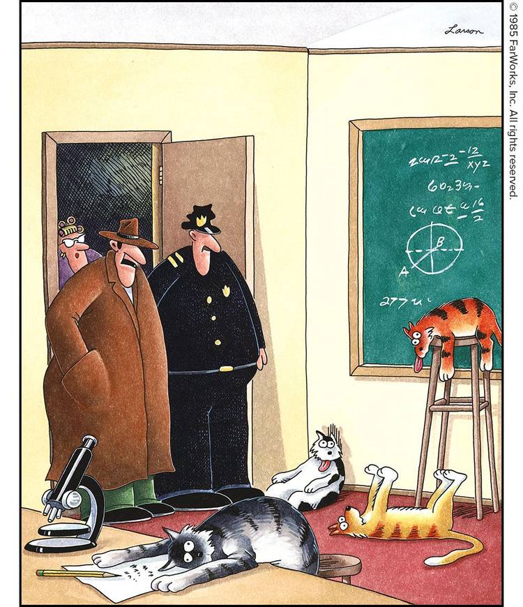 ¿Qué sucede cuando los gatos persiguen la educación superior? Aparentemente, todos caen muertos. Larson da un nuevo significado a “La curiosidad mató al gato” Al mostrar un aula de felinos sin vida, víctimas de su propio impulso académico. Es una triple victoria de Larson, combinando un entorno escolar con humor negro y su amor exclusivo por los animales antropomorfizados en roles ridículos.