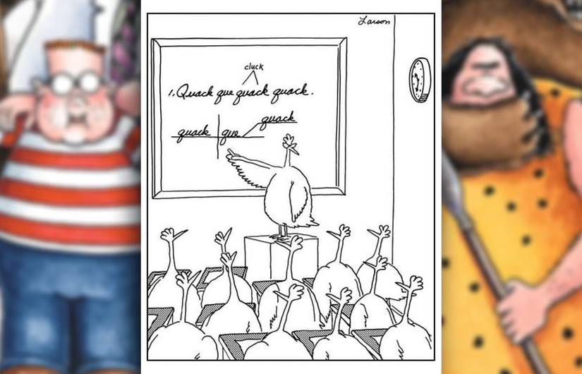 En otro ejemplo brillante del amor de Larson por los animales antropomórficos en los roles humanos, esto Lado lejano El cómic apunta a la clase de idiomas. La mayoría de nosotros tuvimos que soportar español, francés o alemán, pero aquí, el tema es “Pato.” Y en lugar de estudiantes humanos, es una habitación llena de pollos.