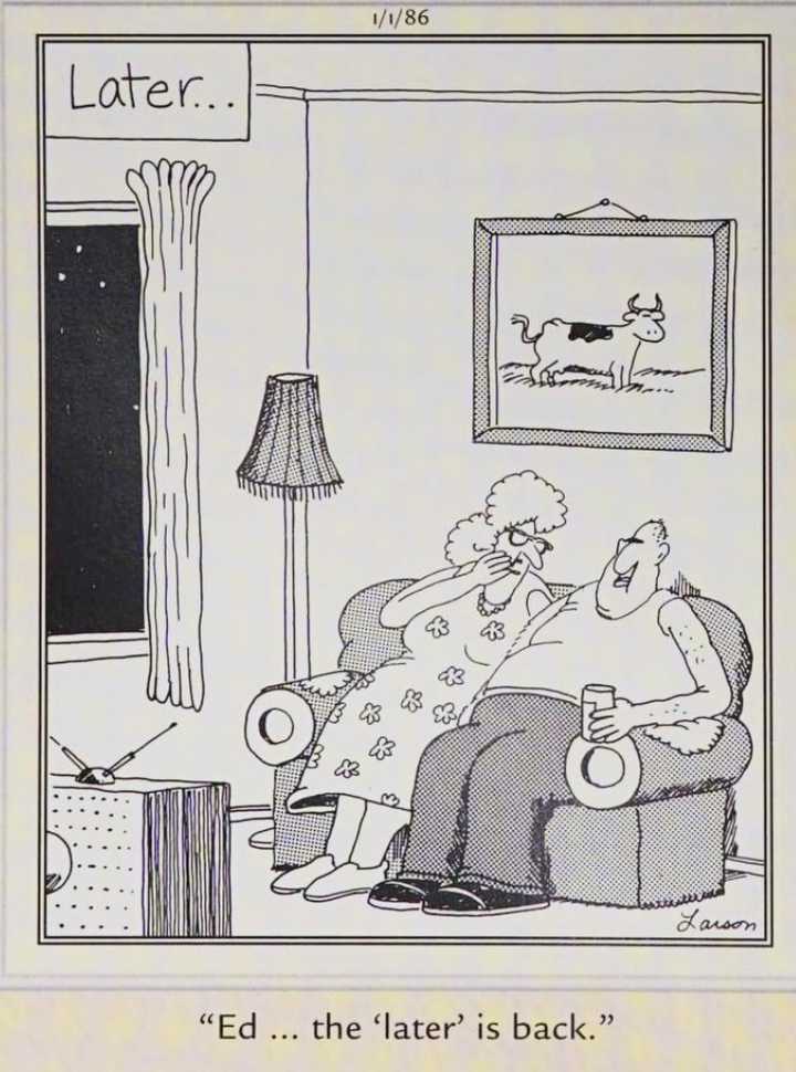 Nuestra última parada en este recorrido por Los lados lejanos de principios de 1986 es el día de Año Nuevo. Cabe mencionar que este fue el sexto aniversario de El otro ladoque debutó el 1 de enero de 1980. Gary Larson comenzó el año con otro rompedor de la cuarta pared, uno de los mejores de todos los tiempos, además. “Ed…el último ha vuelto.“, le susurra una mujer a su marido, notando que la leyenda invade su espacio personal.
