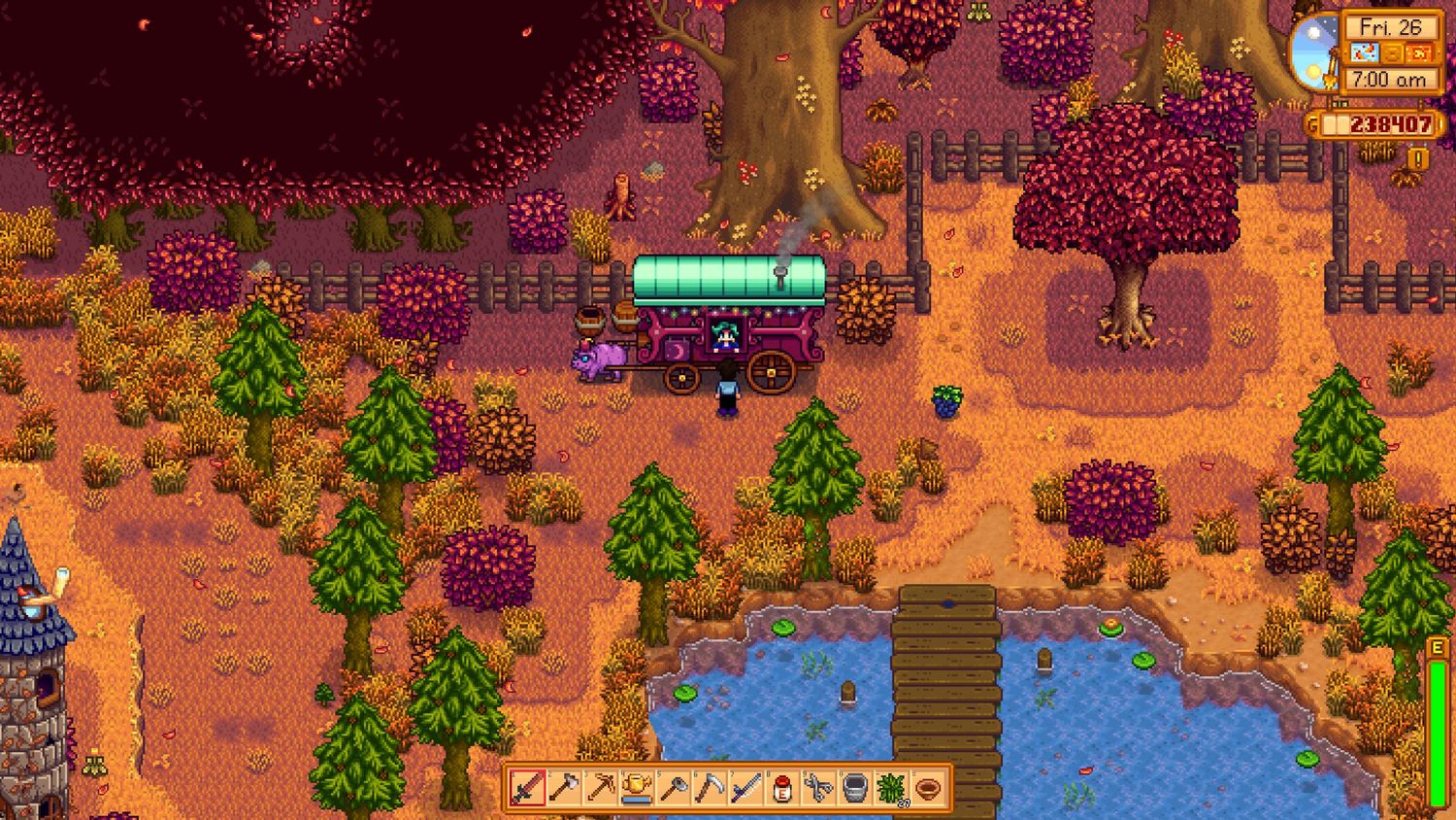 El carro ambulante llega a Pelican Town todos los viernes y domingos y se puede encontrar justo al sur de su granja. The Cart vende muebles y una selección aleatoria de artículos, incluidos cultivos, semillas y pescado fuera de temporada. Si desea completar los paquetes del Centro comunitario, entonces es esencial visitar el Travelling Cart.