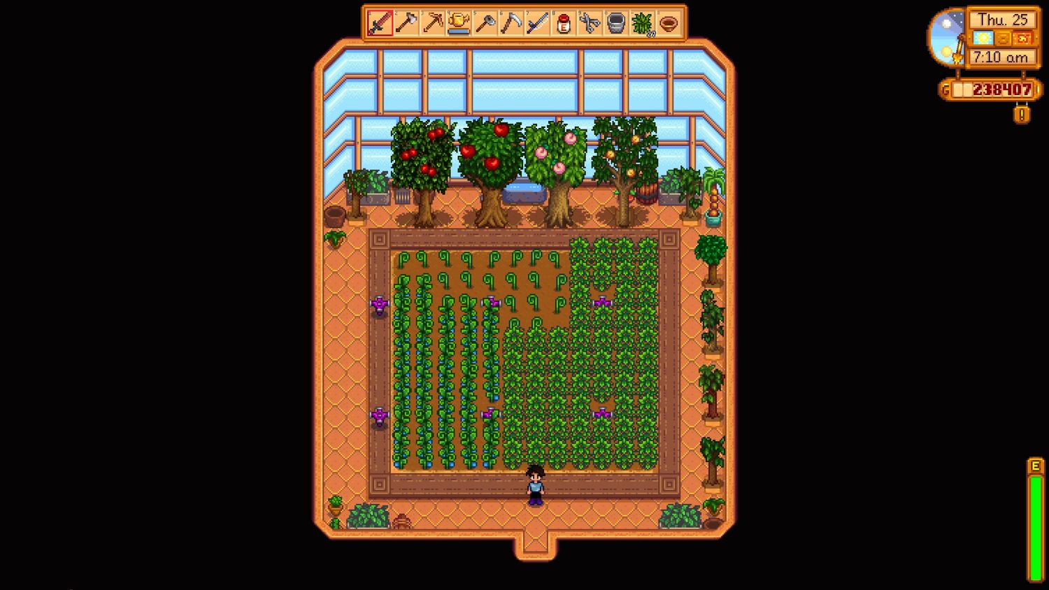 Si logras completar todos los paquetes en la despensa del centro comunitario, se restaurará el invernadero de tu granja. Dentro del invernadero hay una pequeña parcela de tierra donde puedes cultivar plantas durante todo el año independientemente de sus estaciones nativas, lo que lo convierte en el lugar perfecto para tus cultivos más rentables. Esto incluye cultivos más raros que producen múltiples cosechas, como fresas y frutas antiguas raras.