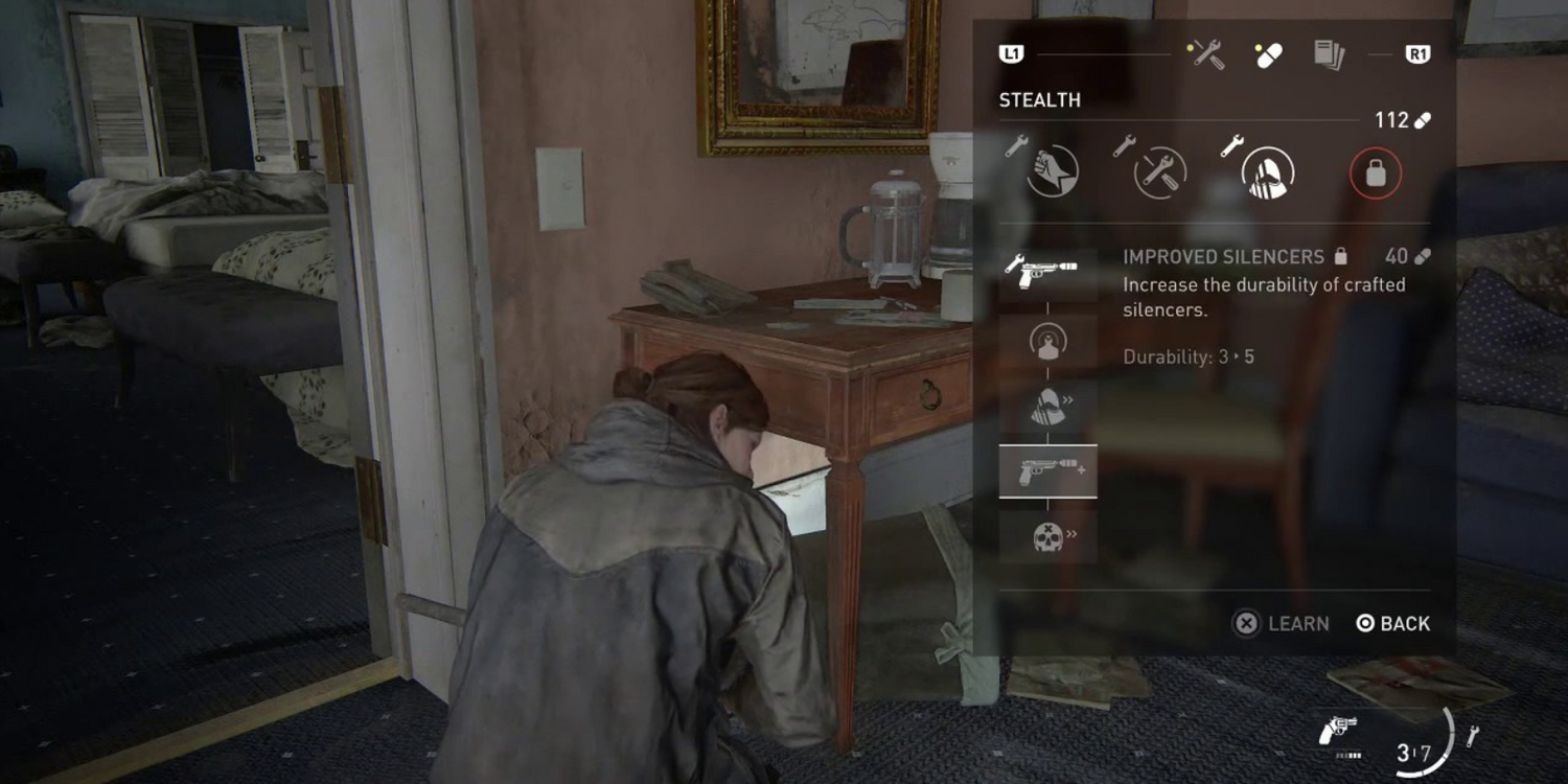 Estos mejorarán las habilidades de Ellie de forma permanente, pero al igual que tus armas, no podrás mejorar completamente todas las categorías en una sola partida. Ellie tiene cuatro árboles de habilidades que se pueden mejorar: supervivencia, artesanía, sigilo y precisión.