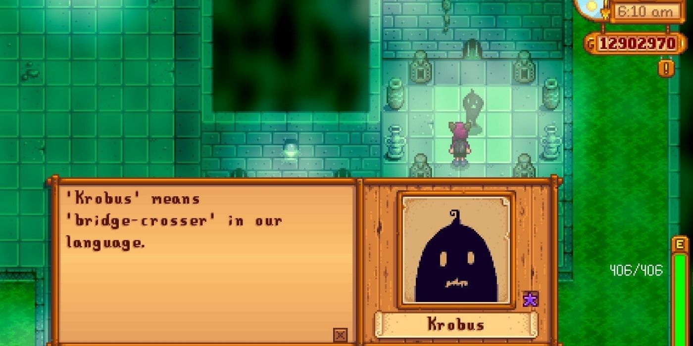 Una vez que uses Rusty Key en uno de los dos puntos de acceso, podrás conocer a Krobus, un amigable monstruo de las sombras que vende una variedad única de artículos mágicos y raros. Algunos de sus mejores productos incluyen huevos vacíos, que te permiten criar pollos vacíos., un Stardrop y el Return Scepter, que te permitirán teletransportarte de regreso a tu granja. También puedes coger uno de Valle stardewEl pez legendario de las aguas radiactivas.