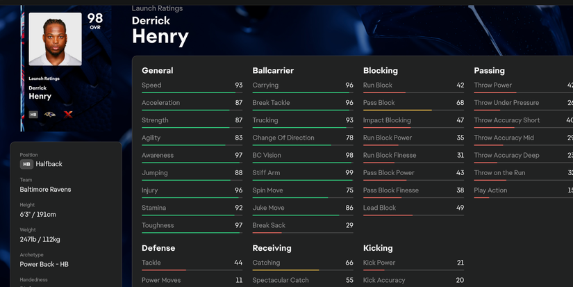 Su velocidad de 93 es aterradora, especialmente cuando se combina con 98 bola de visión de transporte, 99 brazo rígido y 96 break tackle. Henry siempre ha sido conocido por su poderosa carrera, y su capacidad de flete de Factor Superstar de Factor X aumenta aún más su capacidad para romper los tacleados. Básicamente, Henry es muy difícil de detener.