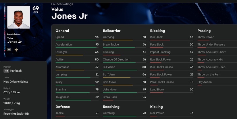 Jones lucha en otra parte con una calificación general de solo 69. Sin embargo, con su velocidad, junto con su aceleración 95, tiene una herramienta vital que puede causar problemas para cualquier defensa.