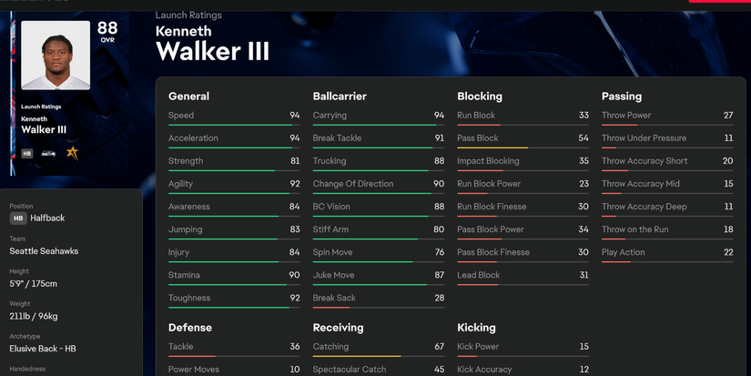 Uno de los mejores corredores versátiles disponible en Madden NFL 26 es Kenneth Walker. Jugando para los Seattle Seahawks, Walker tiene todas las habilidades para causar los problemas de la oposición, convirtiéndolo en alguien que debes tratar de conseguir cuando juegas al modo de franquicia.