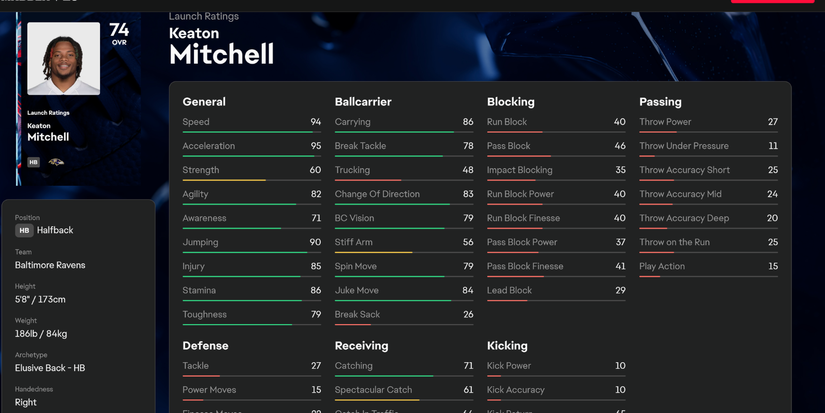 Si bien no es tan redondeado como Henry, Mitchell tiene un ritmo aún más rápidocon una velocidad de 94 y aceleración de 95. Mitchell es ciertamente uno para vigilar en el futuro, pero si estás usando los cuervos, puede entrar y hacer algunas jugadas que cambian el juego con su velocidad.