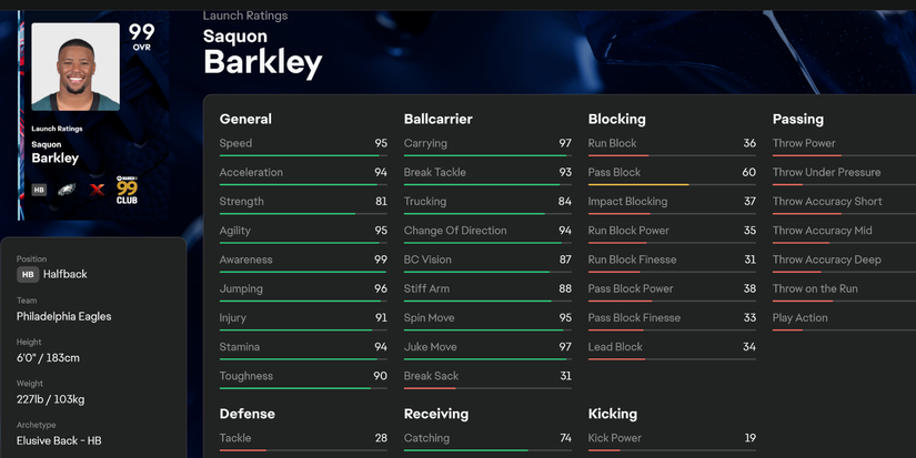 Todas sus estadísticas relacionadas con la velocidad son ridículas. 95 velocidad, 94 aceleración, 95 agilidad, 99 conciencia. Barkley también tiene todas las habilidades para igualar con las estadísticas de alto transporte, movimiento de juke, movimiento de giro y cambio de dirección.