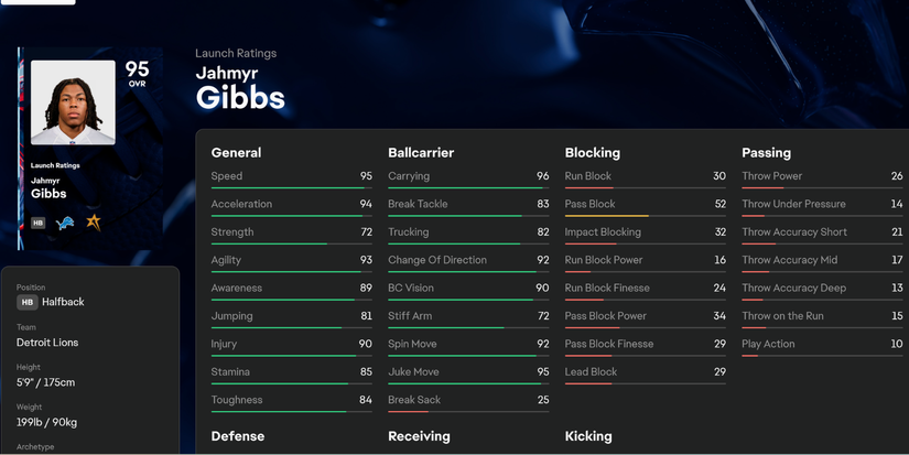 En lo que será solo su tercera temporada profesional, Gibbs tiene una calificación general de 95, con su estadísticas de 95 velocidades jugando un papel importante en esto. Sin embargo, todas sus estadísticas físicas y portadoras de pelota respaldan esto.