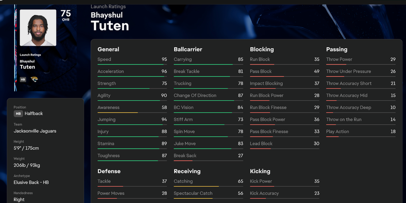 Como novato directamente fuera de la universidad, Tuten es un poco difícil en los bordes, y eso se muestra en sus estadísticas. Esto incluye una calificación general de 75, pero tiene mucho tiempo para mejorar si lo agrega a su lista en Madden NFL 26.