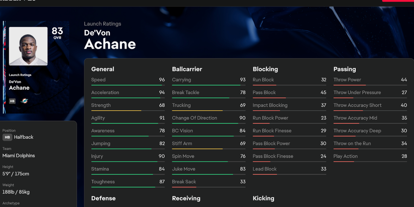 Achane es el único RB este año con 96 velocidad, un número coincidente por el QB Jamal Jackson. La estrella de los Dolphins también tiene 94 aceleración y 91 agilidad, así como estadísticas sólidas de transporte de pelota y cambio de dirección.