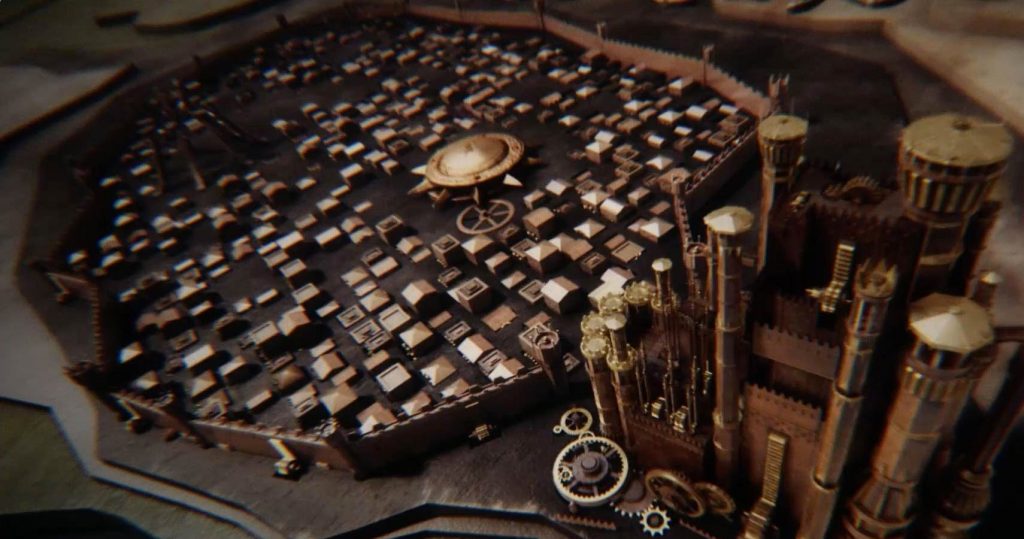 Se aprobó el método del modelo tridimensional CGI, y aunque la estética de la perinola era increíble, no había una sensación de escala en ninguno de los edificios o sus entornos. A medida que avanzaba la serie, el equipo de producción podría comenzar a concebir la escala, de modo que para la Temporada 8, las estructuras presentadas en la introducción fueran a escala (utilizando un ser humano como referencia).
