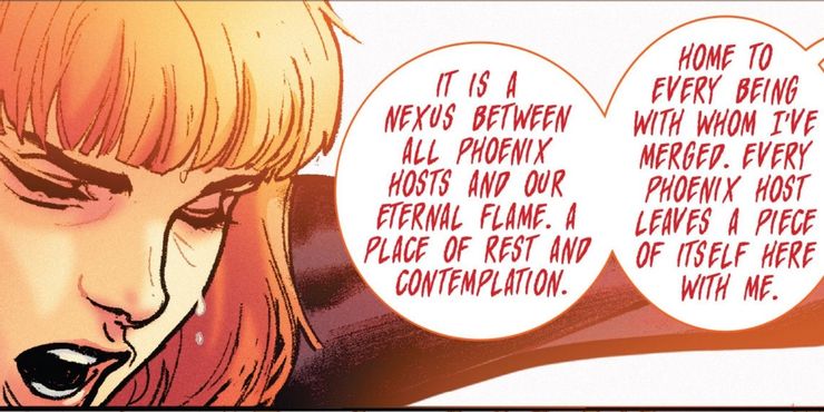Además, una vez que Jean se convierte en el Fénix Blanco de la Corona, asciende a la llamada Sala Caliente Blanca. En palabras de Phoenix, el White Hot Room es “un nexo entre todos los anfitriones de Phoenix y nuestra llama eterna”. Básicamente, es el lugar donde el Fénix vive, muere y vuelve a la vida.