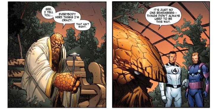 Allí, descubre que Ben Grimm no ha envejecido demasiado, aunque ahora tiene una barba rocosa y depende de un bastón. La sugerencia es que podría vivir mucho tiempo, aunque no es exactamente inmortal como otros personajes de Marvel.